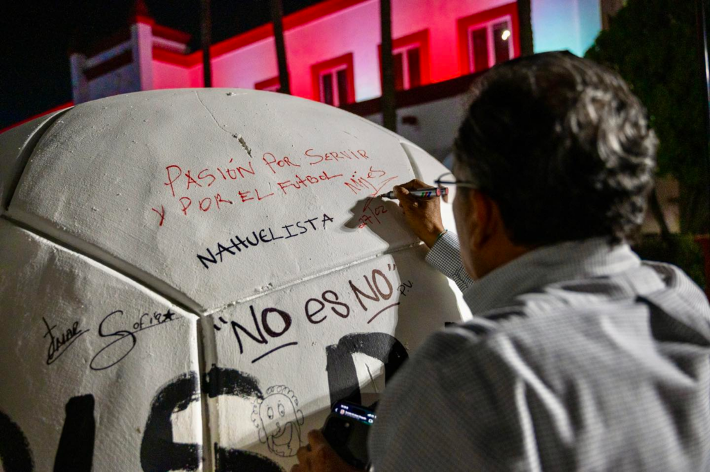 Entre los participantes también estuvo el poeta Armando Alanís, quien al igual que el alcalde Mijes y los ciudadanos dejó impresa una frase: «Disparos solo que sean a gol.