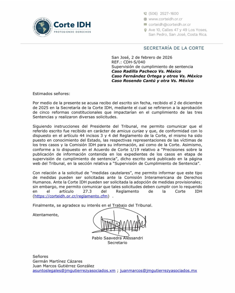Gutiérrez González dice; “justamente dos meses después, el día 2 de febrero, la secretaria de la Corte IDH acusa de recibido nuestra demanda y además informa que fue recibido en carácter de -amicus curiae- lo cual significa que será puesto a disposición del estado mexicano, las respectivas representaciones de las victimas de los tres casos, así como la Comisión IDH para su información y de la Corte. Es importante destacar que con base al Acuerdo 1/19 se publicaran en la pagina web de la Corte los expedientes de los casos en etapa de supervisión de cumplimiento de la sentencia dictada hace 10 años”.
