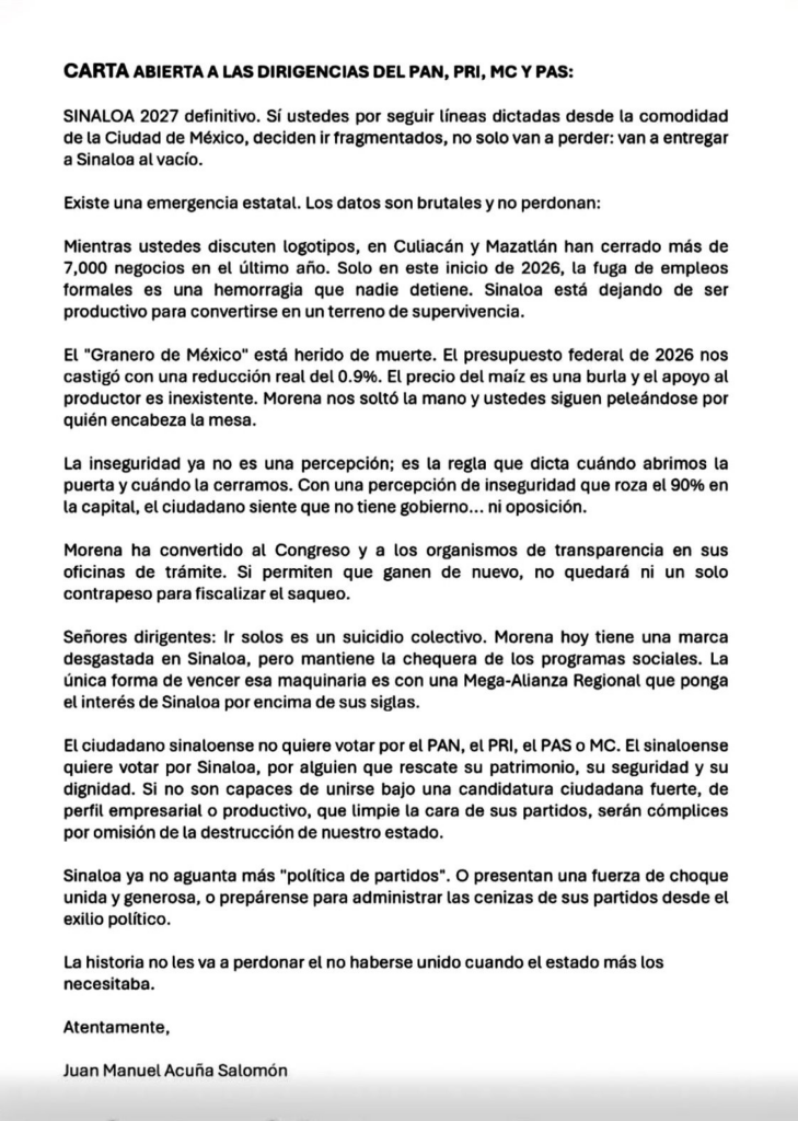 El ciudadano sinaloense no quiere votar por el PAN, el PRI, el PAS o MC. El sinaloense quiere votar por Sinaloa, por alguien que rescate su patrimonio, su seguridad y su dignidad.