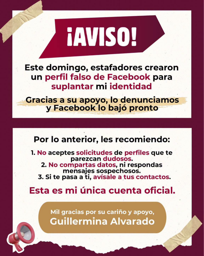 La directora del Consejo Nacional de Normalización y Certificación de Competencias Laborales (CONOCER), Guillermina “Guille” Alvarado, alertó sobre un caso de suplantación de identidad en Facebook, luego de que estafadores crearan un perfil falso utilizando su nombre.