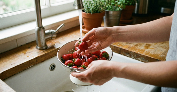 2. Lava sin quitar el tallo: Enjuaga las fresas bajo el chorro de agua fría antes de quitarles las hojas verdes. Si retiras el tallo antes de lavar, las bacterias de la superficie y el agua sucia pueden entrar al interior de la fruta a través del corte.